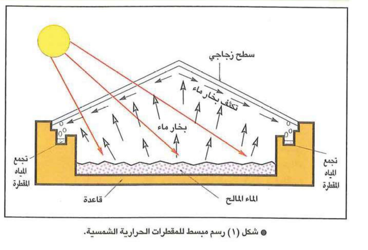 باستخدام الطاقة الشمسية ، وتتألف المقطرات الحرارية عادة من قاعدة اسفلتية وأسقف زجاجية مائلة ، شكل (١) ، تمر المياه المالحة على قاعدة المقطر الحراري المرتفعالة الحرارة لتتبخار وتتكثف على الأسطح الداخلية للغطاء الزجاجي المنفذ للاشعه الشمسية، ومن ثم تجمع المياه المكثفة على جوانب الغطاء الزجاجي كمياه عذبة منتجة ، ويبلغ متوسط المياه المحلاة بالمقطرات الشمسية 4 الترات لكل متر مربع من المقطر الحراري . ومن أهم العوامل المؤثرة على المقطرات الحرارية مايلي :