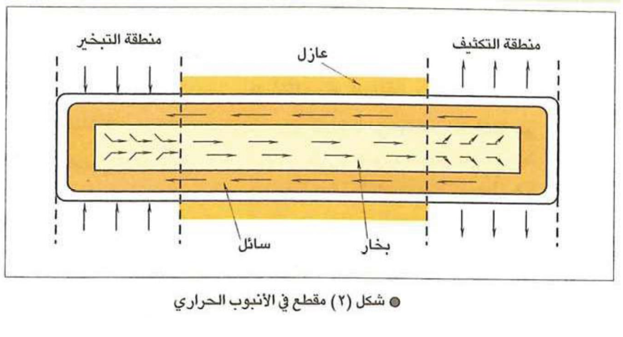 يتكون الانبوب الحراري ، شكل (٢) ، من تجويف مفرغ من الهواء ومغلق من الطرفين ومحتوي على كمية قليلة من سائل مضغوط يستخدم كوسيط لنقل الطاقة الشمسية من منطقة التبخير – عند تعرضه لأشعة الشمس – إلى منطقة التبريد حيث يتكثف ويطلق الحرارة الكامنة للتكثيف ثم يعود مرة أخرى إلى منطقة التبخير خلال تجويفات صغيرة تحت تأثير القوى الشعيرية (Capillaries) وهكذا يتبخر السائل الناقل للحرارة بفعل الطاقة الشمسية ويتكثف ويعطي حرارة عالية تفوق تلك التي حصل عليها عند تبخره . وتنتقل الحرارة في الأنابيب الحرارية بشكل أفضل عند استخدام مائع له كثافة عالية وسرعة انتشار منخفضة في الحالة الغازية، وبذا يعمل الأنبوب الحراري عند درجة حرارة ثابتة ويحتاج إلى فارق يسير في الضغط بين منطقتى التبخير والتكثيف. ويبيان الجدول (١) بعض خواص الأنابيب الحرارية .