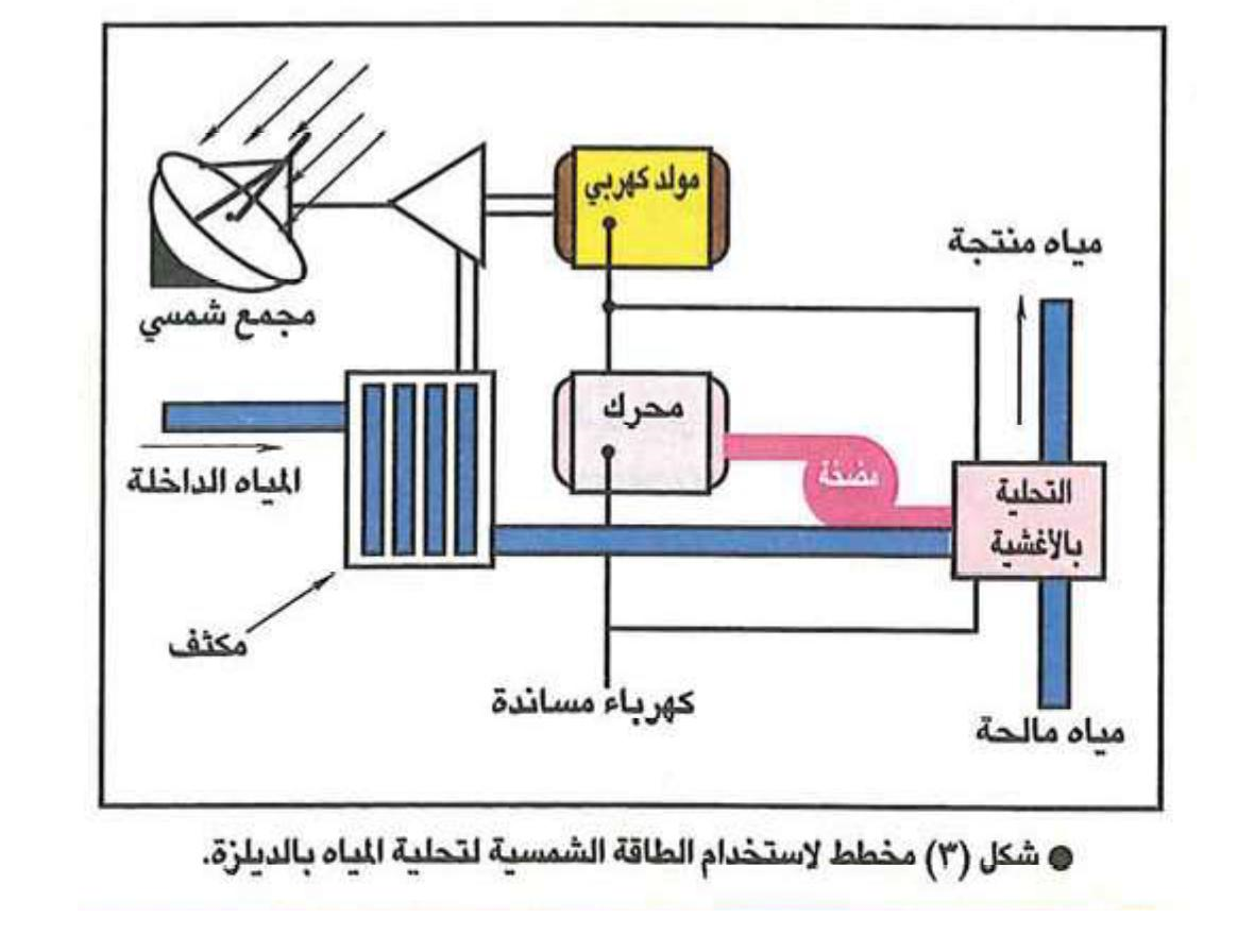 قامت المملكة العربية السعودية ايضاً بإنشاء محطة لتحلية المياه بالطاقة ضمن برنامج التعاون المشترك بين المملكة والولايات المتحدة الأمريكية (Soleras)، ويبين الشكل (٢) مخططاً لمحطة تحلية المياه بالديلزة تعمل بالطاقة الشمسية. وقد أجريت تصاميم مختلفة على مثل هذه المحطات لإنتاج مياه محلاة بمعدل (150-15 م 3/یوم) بترکیز 500 جزء قی المليون من الأملاح . صممت محطة ينبع لتحلية المياه بالتجميد غير المباشر وفق أحدث الطرق ، وهى تعد منشأة أبحاث بغرض أجراء مجموعة مكثفة من اختبارات الأداء والتقييم، وتنتج المحطلة 2٠٠ م " من المياه العذبة (5239 جالون) یومیاً تستمد،