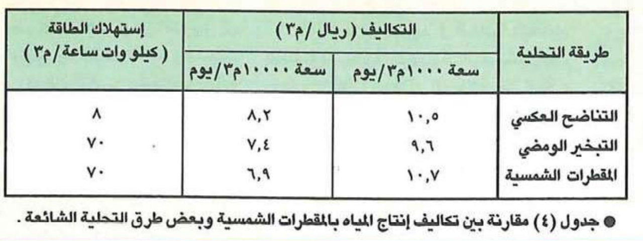 تعد إقامة منشآت تحلية المياه بالطاقة الشمسية وحتى سعة ٧٠م "/يوم أقل تكلفة من طرق نقل المياه لمنطقة تبعد ١٦ کیلومتر آو آکثر عن مکان توفیر الیاه، خاصة في المناطق النائية قليلة السكان . بل وعلاوة على هذا فإن طرق تحلية المياه بالمقطرات الشمسية تعد اقتصادية مقارنة بطرق التحلية الشائعة كالتبخير الومضي والتقطير متعدد التأثير والتناضح العكسى التي تستخدم الوقود العادي أو الكهر باء كما هو موضح في الجدول (٤). تعد طريقة التناضح العكسي العاملة بالطاقة الشمسية من أفضل طرق التحلية في المناطق النائية قليلة السكان . وحسب دراسة للدكتور عبدالرحمن عبدالفتاح